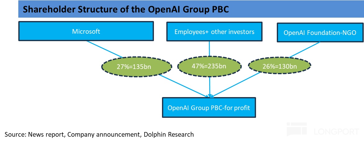 延展開來看,近期OpenAI與微軟的反復拉扯和此次簽訂新合約背後的綫索主要有2條:1)是OpenAI自身有將其運營主體由原先的公益性/非營利性的組織架構,調整為盈利性組織的訴求。以便後續更方便進行融資乃至上市,也能為其股東、管理層、員工帶來更多的財富收益。