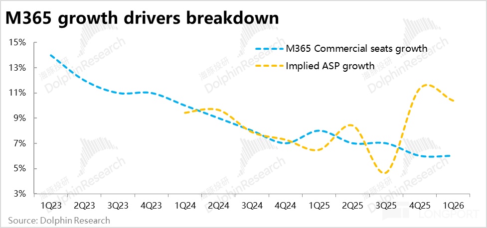 從量價角度來看,1)本季商用M365的訂閱坐席數量同比增加了7%,增速較上季度持平;2)平均客單價的同比漲幅則從上季的11.3%收窄到10.4%。