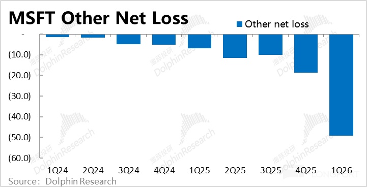 剔除其他損益中來自投資/利息損益的部分,剩下的部分在F1Q24~1Q26的兩年間,由虧損僅略超1億,大幅增長到單季虧損約49億。反映了微軟確認OAI虧損的快速擴大,對微軟整體淨利潤的拖累也越發明顯。