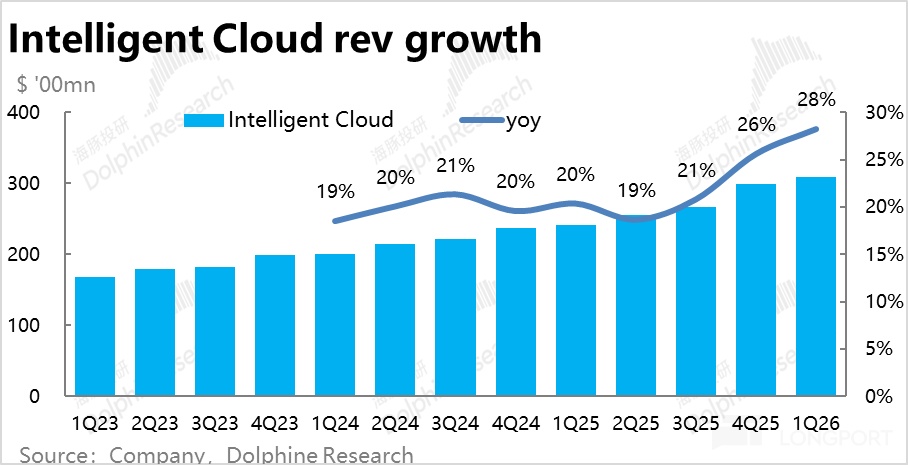 整體上,因Azure的增速環比提速1pct,且Azure外服務器産品的收入增速也扭跌轉升,智慧雲板塊本季整體收入$309億,同比增長28%,好於市場預期2.4%。