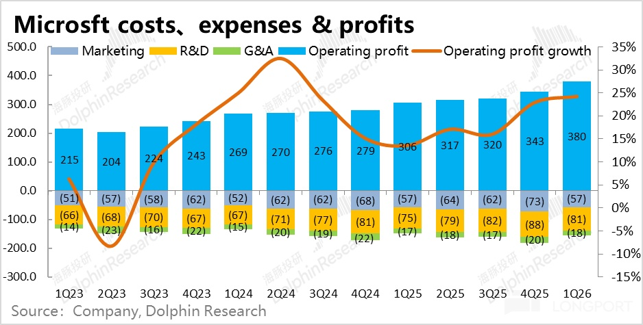 2)費用角度,微軟本季的營銷、研發和管理費用三費合計同比增長僅4.9%,相比上季的5.8%繼續收窄,也遠低於營收和毛利潤約18%的增速,因此費用率同比來看被攤薄了2pct。具體來看,營銷費用零增長是主要功臣,而研發和管理費用則都同比增長了約8%。