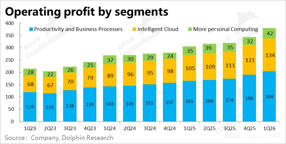 3)整體上,由於對經營費用的控制擠出的利潤率遠多於毛利率的下滑,本季度微軟整體實際經營利潤率整整同比走高了2.3pct。最終經營利潤$380億,同比增長了24%,大幅跑贏營收增速。