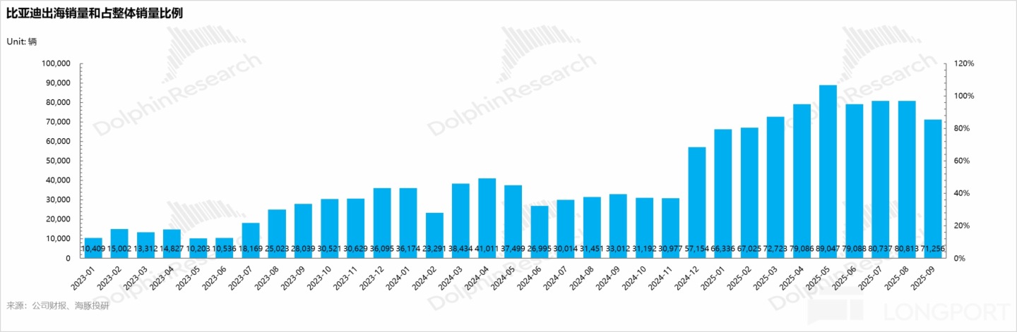 2025 年前三季度比亞迪出海銷量 68.6 萬輛,同比提升 130%,預計 2025 年出海銷量能完成年初制定的 90-100 萬海外銷量目標。