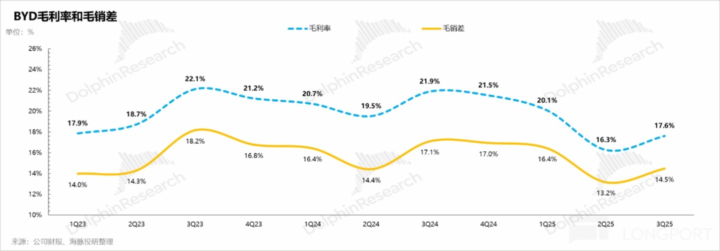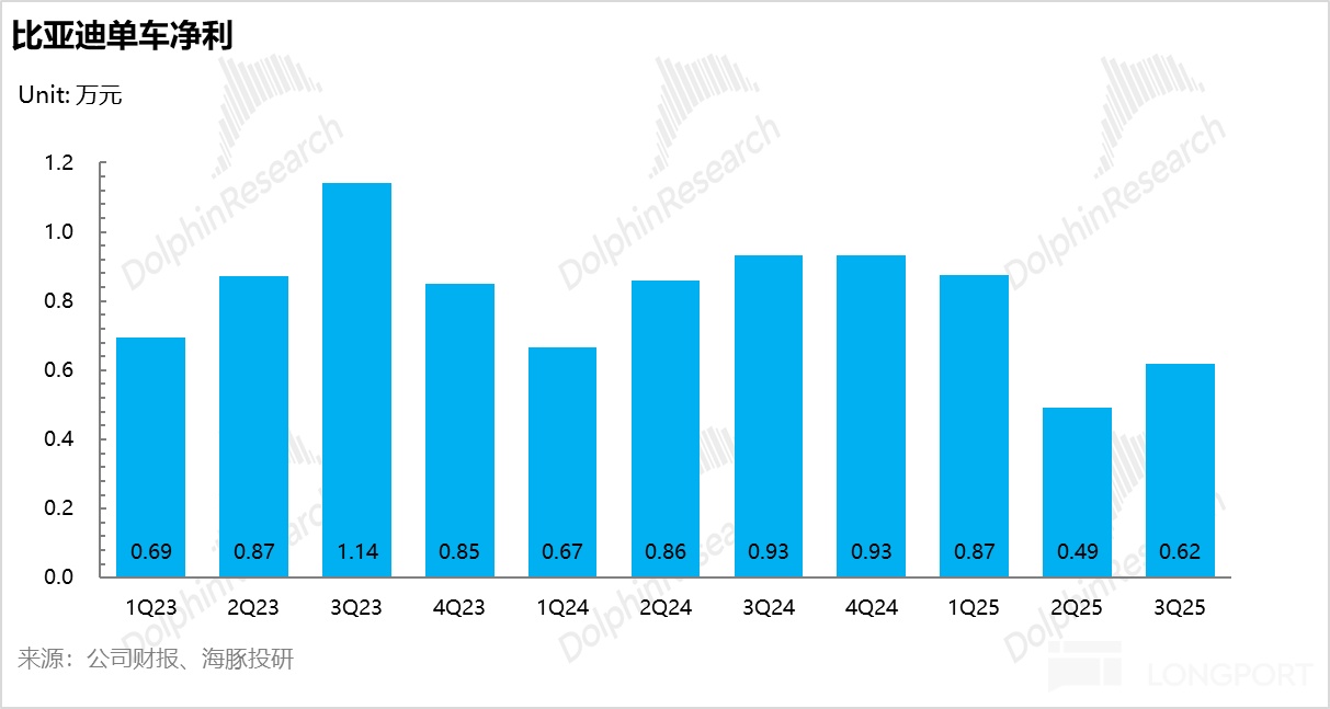 三季度單車價格繼續環比下滑 600 元至 13.67 萬元,雖然三季度比亞迪受制於反内卷政策,對二季度大規模的促銷折扣有所收回(可見《比亞迪:血洗新能源,「價格屠夫」 再次來襲!》)。