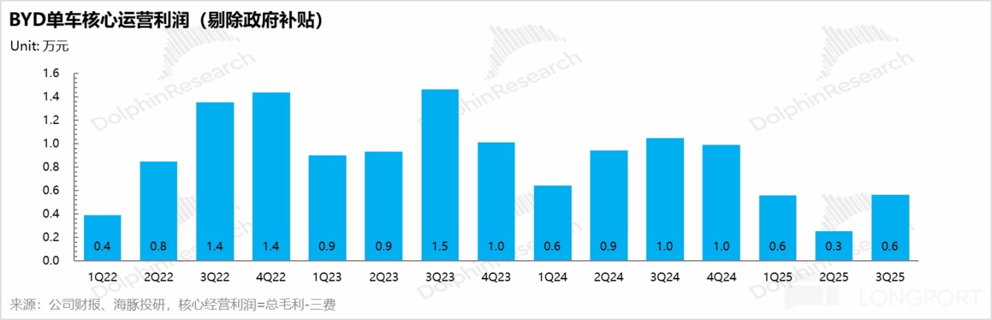 而如果看比亞迪的單車核心利潤情況(核心經營利潤=總毛利 - 三費),比亞迪的單車核心經營利潤終於也有所回升,從上季度的最低谷 0.25 萬元回升至本季度 0.57 萬元,基本與一季度持平,環比回升的主要原因仍然是賣車毛利率的環比上行,以及對三費的大幅縮減,核心經營利潤率也從上季度的 1.4% 環比上行至本季度 3.2%。