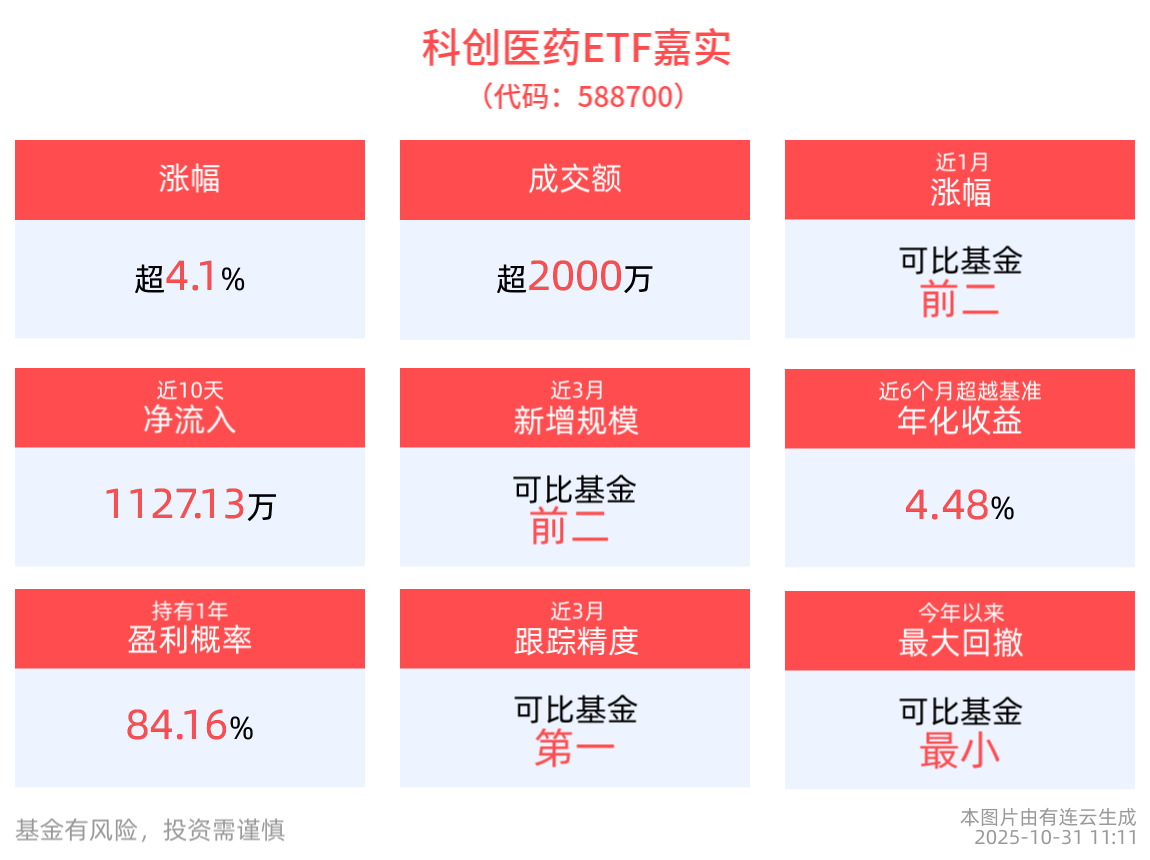 截至10月30日,科創醫藥ETF嘉實近1年淨值上漲27.50%。從收益能力看,截至2025年10月30日,科創醫藥ETF嘉實自成立以來,最高單月回報為23.29%,最長連漲月數為7個月,最長連漲漲幅為48.33%,上漲月份平均收益率為7.85%。