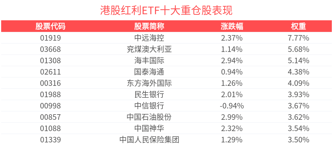 數據顯示,截至2025年10月31日,中證港股通高股息投資指數前十大權重股分別為中遠海控、兗煤澳大利亞、海豐國際、東方海外國際、中國石油股份、中信銀行、國泰海通、中國神華、民生銀行、中國人民保險集團,前十大權重股合計佔比46.3%。