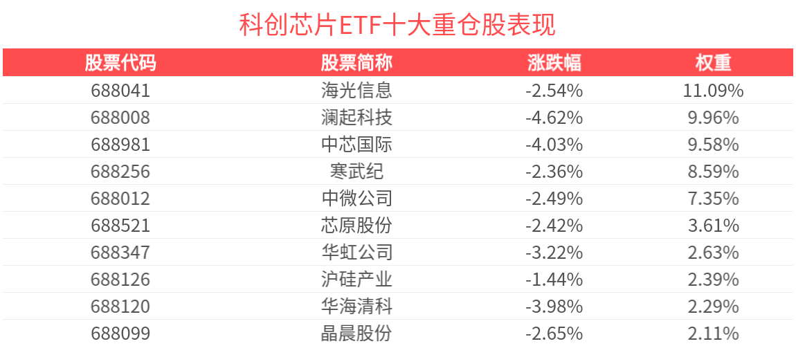 數據顯示,截至2025年10月31日,上證科創板芯片指數前十大權重股分別為海光信息、寒武紀、瀾起科技、中芯國際、中微公司、芯原股份、華虹公司、拓荊科技、佰維存儲、滬矽産業,前十大權重股合計佔比60.55%。