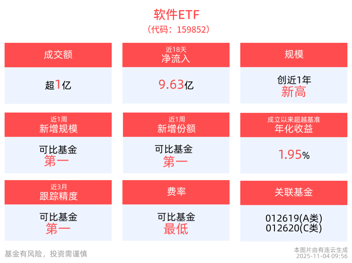 資金流入方面,軟件ETF最新資金淨流入1.36億元。拉長時間看,近18個交易日内,合計「吸金」9.63億元。