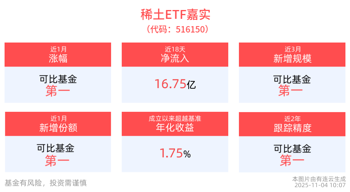 截至11月3日,稀土ETF嘉實近2年淨值上漲86.47%,指數股票型基金排名105/2380,居於前4.41%。從收益能力看,截至2025年11月3日,稀土ETF嘉實自成立以來,最高單月回報為41.25%,最長連漲月數為4個月,最長連漲漲幅為83.89%,上漲月份平均收益率為10.57%。