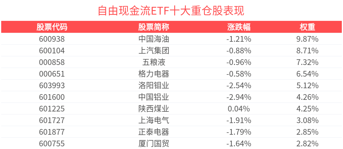 自由現金流ETF(159201)緊密跟蹤國證自由現金流指數,數據顯示,截至2025年10月31日,國證自由現金流指數(980092)前十大權重股分別為中國海油、上汽集團、五糧液、格力電器、洛陽鉬業、中國鋁業、陝西煤業、上海電氣、廈門國貿和正泰電器,前十大權重股合計佔比54.79%。