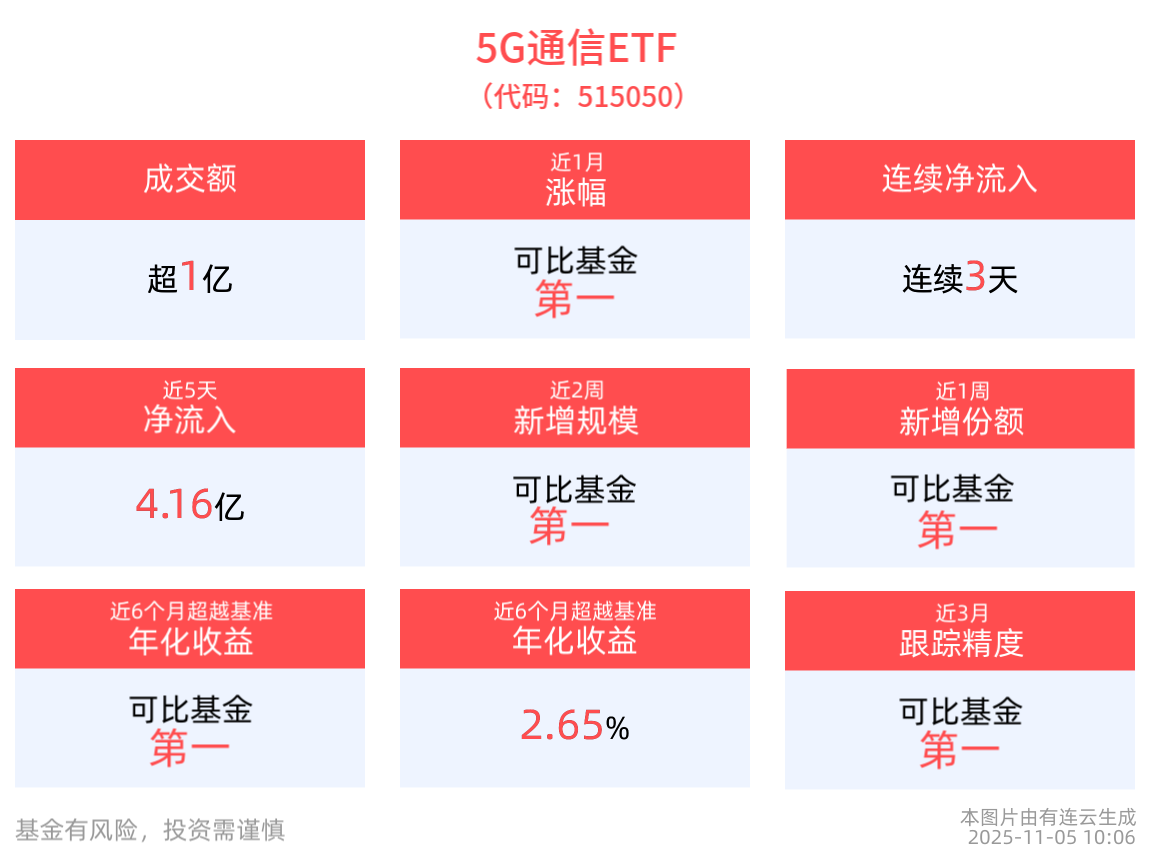 數據顯示,截至11月4日,5G通信ETF近3年淨值上漲156.43%,指數股票型基金排名6/1906,居於前0.31%。從收益能力看,截至2025年11月4日,5G通信ETF自成立以來,最高單月回報為37.75%,最長連漲月數為5個月,最長連漲漲幅為113.89%,漲跌月數比為39/34,上漲月份平均收益率為8.26%,年盈利百分比為80.00%。截至2025年11月4日,5G通信ETF近6個月超越基準年化收益為2.65%,排名可比基金第一。