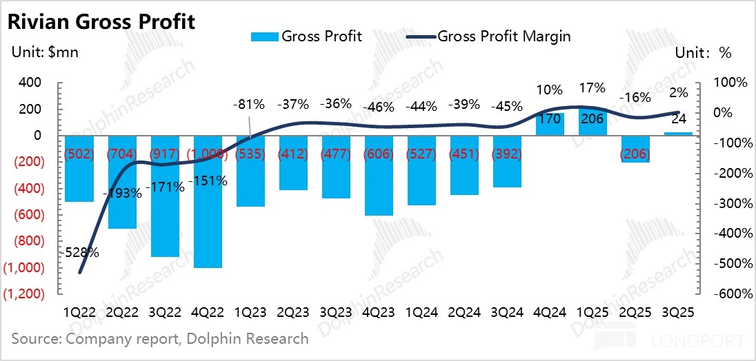 而在賣車毛利率端,同樣由於銷量的環比上行,以及 Rivian 自身對於採購成本的進一步壓降,最後真實的賣車毛利率也大幅上行,也是 Rivian 賣車以來毛利率表現最好的一個季度。