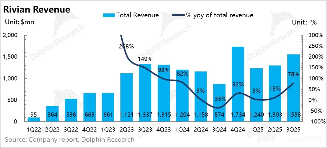 回想一下 Rivian 上季度深虧的業績主要受到了特朗普上台後對於新能源汽車支持力度退坡 + 關稅戰負面影響,雖然本季度 Rivian 同樣也受到碳積分補貼退坡 + 關稅的負面影響,但由於 Rivian 本季度受益於 IRA 補貼退坡前的搶購效應,賣車銷量端在環比回升,以及在三季度搶裝效應下需求端比較有韌性,不需要採取折扣,所以最後賣車收入端也有不錯的表現。
