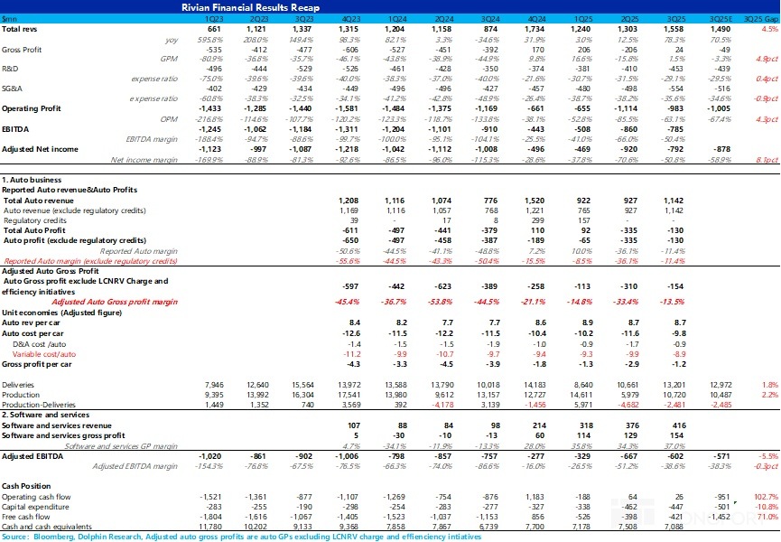 1)三季度毛利率再次轉正:三季度由於 Rivian 仍然受到純毛利的碳積分收入退坡(下半年基本無碳積分確認),以及來自關稅的沖擊對賣車成本的負面影響,所以即使 Rivian 本季度賣車銷量仍然表現不錯(環比上季度上行 24%),但市場仍然沒有給到 Rivian 一個很樂觀的毛利率預期,市場預期的本季度 Rivian 的毛利率仍未轉正(-3.3%)。