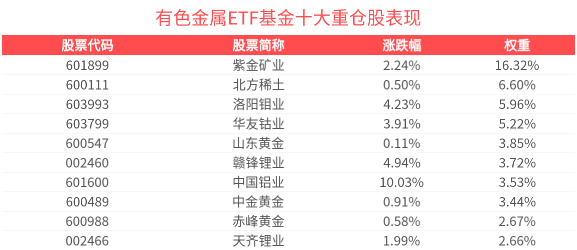 有色金屬ETF基金緊密跟蹤中證細分有色金屬産業主題指數,指數前十大權重股分別為紫金礦業、北方稀土、洛陽鉬業、華友钴業、中國鋁業、贛鋒鋰業、山東黃金、中金黃金、天齊鋰業、赤峰黃金,前十大權重股合計佔比53.58%。