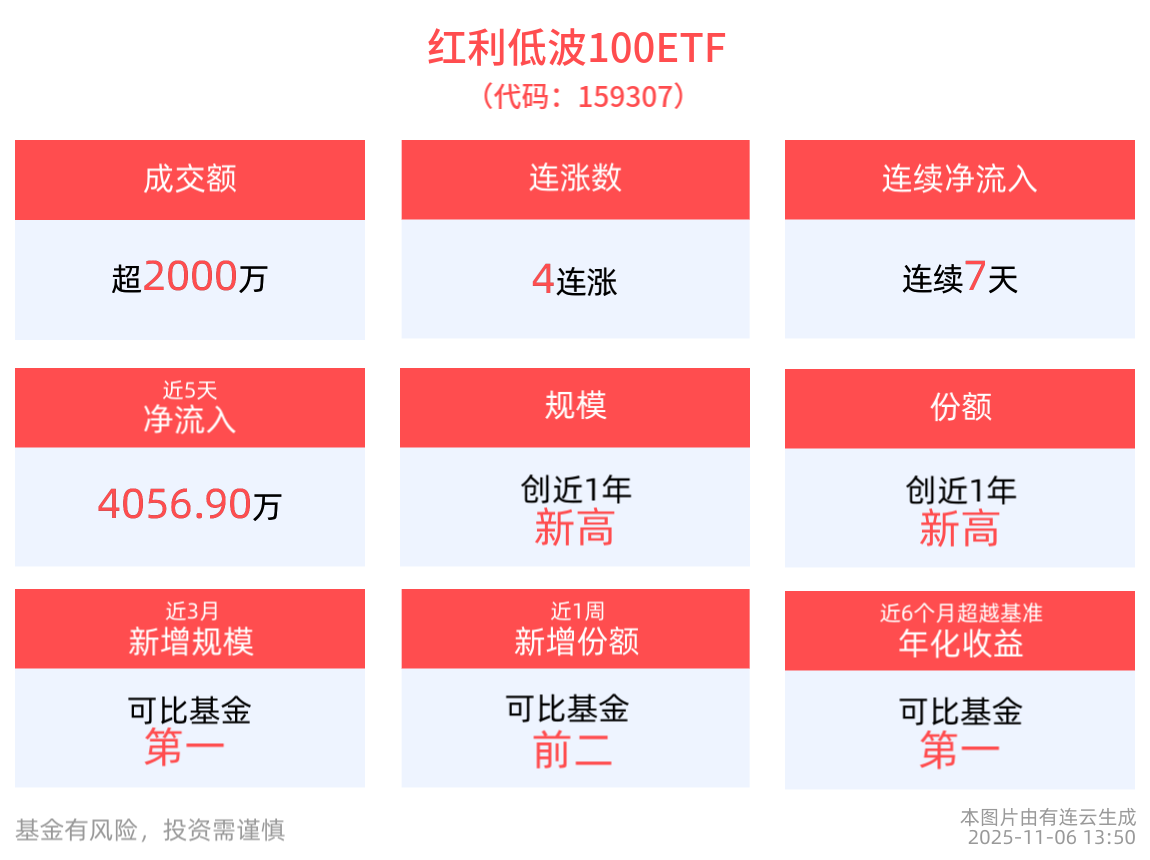 截至2025年11月6日 13:50,中證紅利低波動100指數上漲0.54%,成分股雲天化上漲10.00%,新疆眾和上漲4.63%,特變電工上漲4.52%,華域汽車上漲3.21%,廣州發展上漲2.97%。紅利低波100ETF(159307)上漲0.73%, 沖擊4連漲。最新價報1.11元。拉長時間看,截至2025年11月5日,紅利低波100ETF近1周累計上漲1.29%。