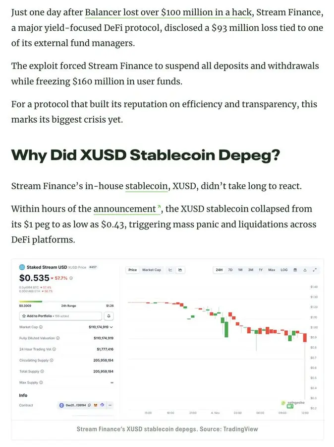 由於缺乏透明度、存在遞歸循環及專有策略,我們實際上無法獲知Stream用戶的損失規模。目前Stream的xUSD穩定幣價格已跌至每單位0.6美元。