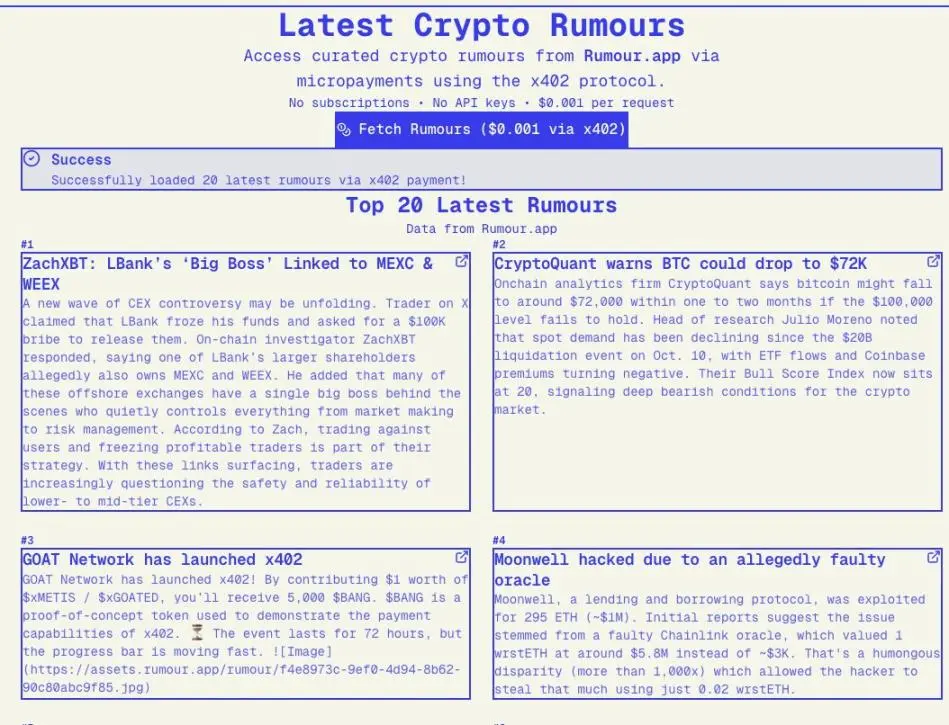 我付了 0.0001 美刀通過 x402 支付協議或取的最新 Crypto 資訊