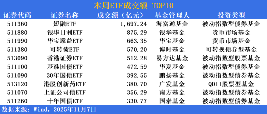 成交額方面,短融ETF(511360)、周成交額破千億,達1697.24億,位居列周成交榜首位;銀華日利ETF(511880)、華寶添益ETF(511990)周成交額達875.29億、663.35億,分居二、三,債券類基金場内交投保持較高活躍度。