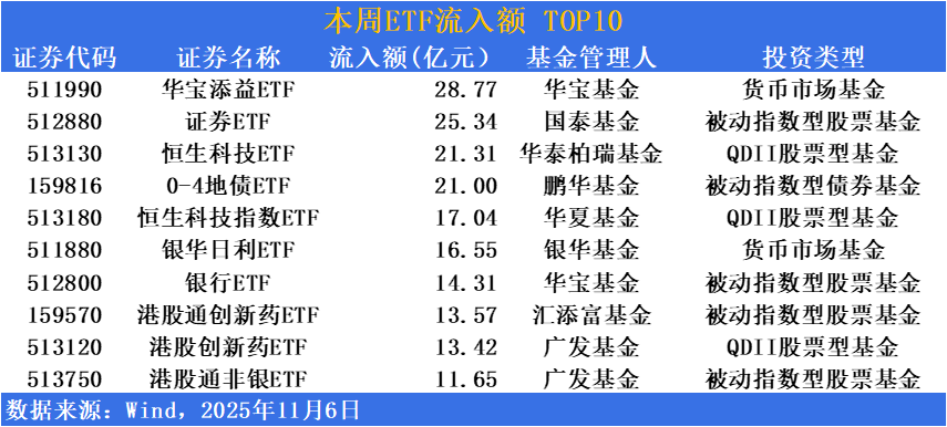 本期(2025年11月3日-11月6日),在板塊内部輪動顯著加速與長期低利率並存的市況下,市場資金對避險屬性的強化及確定性收益渠道的配置訴求持續顯現。兼具穩定股息回報與優質資産特徵的紅利類資産,其長期配置價值邏輯仍具有較強支撐力。華寶添益ETF(511990)流入近30億,位居流入榜第一。證券ETF(512880)流入超35億、恒生科技ETF(513130)流入超20億,位居二、三。