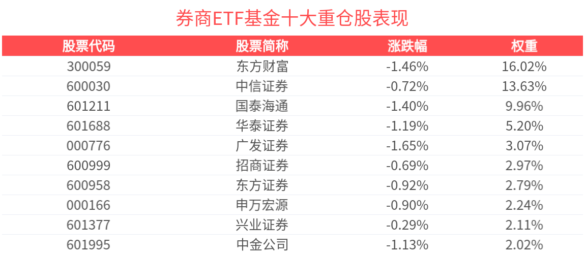 券商ETF基金緊密跟蹤中證全指證券公司指數,截至2025年10月31日,指數前十大權重股分別為東方財富、中信證券、國泰海通、華泰證券、廣發證券、招商證券、東方證券、申萬宏源、興業證券、國信證券,前十大權重股合計佔比59.88%。