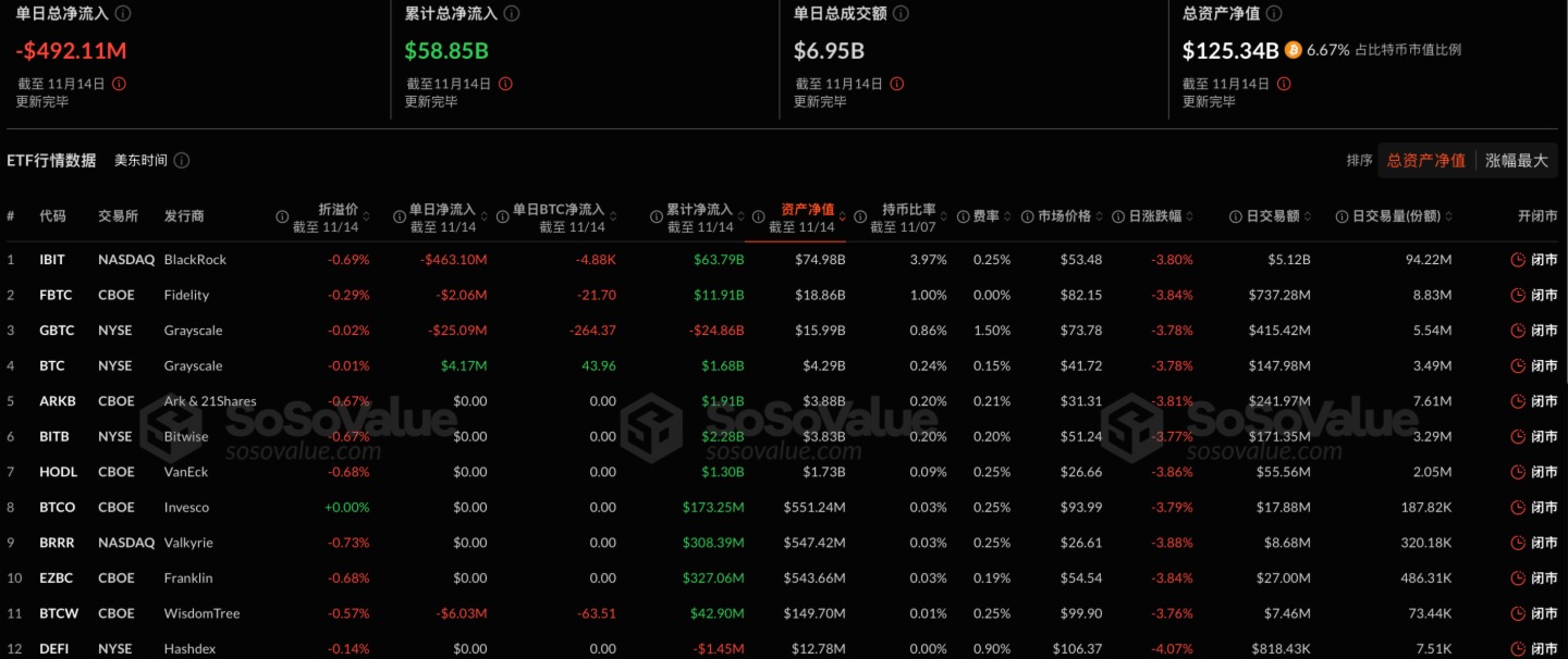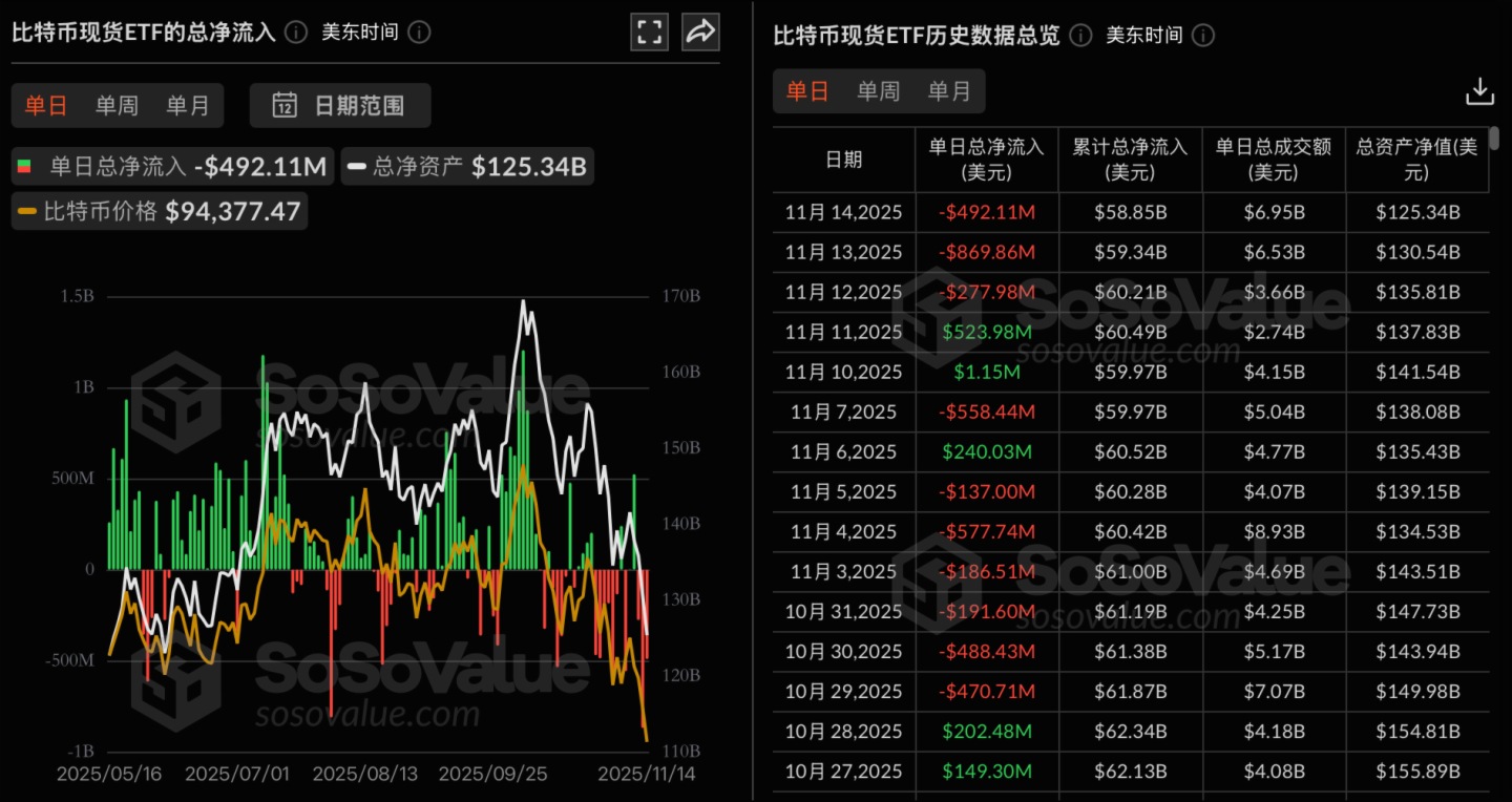 PANews 11月15日消息,根據 SoSoValue 數據,昨日(美東時間 11 月 14 日)比特幣現貨 ETF 總淨流出 4.92 億美元。