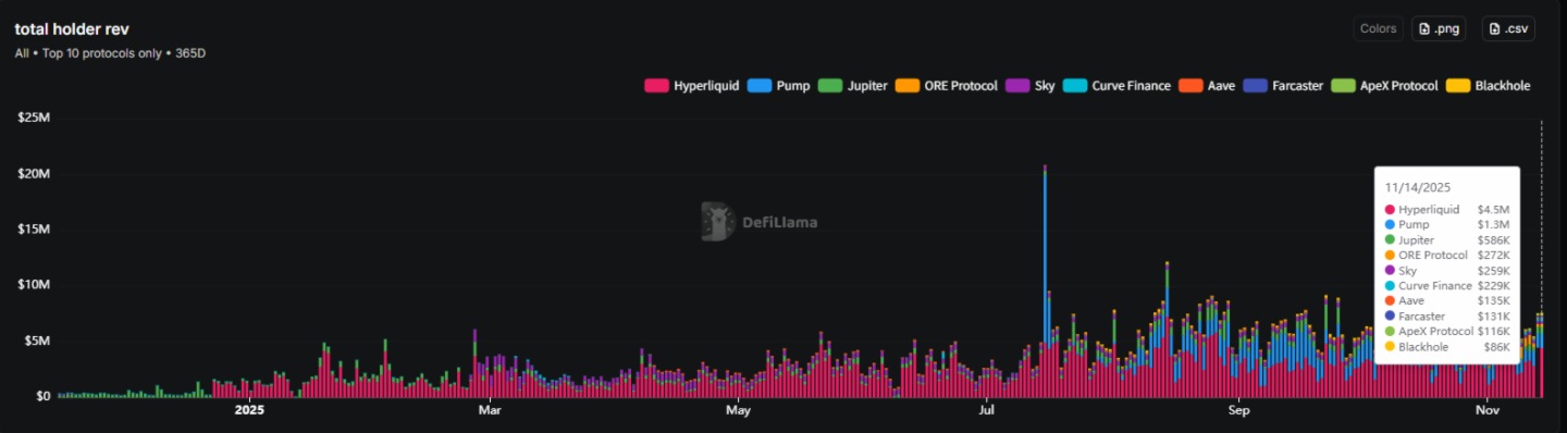 截至11月14日,Pump.fun每日的平均收入仍能維持在100萬美元之上,這個數據在所有的協議當中排名前五。不過,相較年初動辄400萬美元每日的收入相比,這個數據也有了明顯下滑。