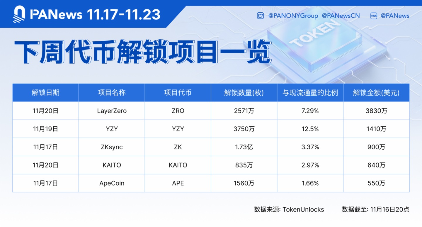 PANews 11月16日消息,Token Unlocks數據顯示,ZRO、YZY、ZK等代幣將於下周迎來大額解鎖,其中: