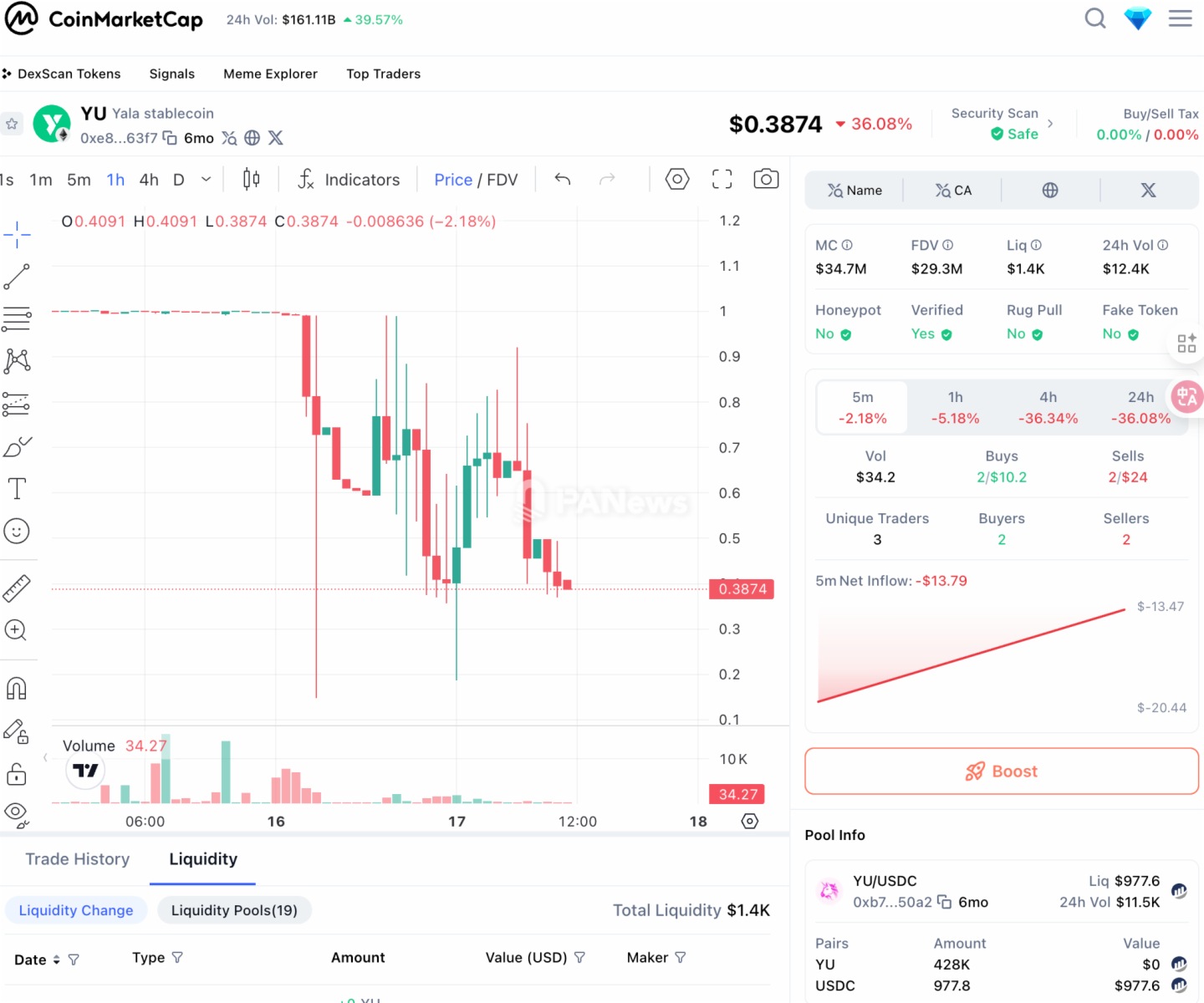 PANews 11月17日消息,CoinMarketCap 數據顯示,比特幣流動性及其原生穩定幣項目 Yala 的 YU 過去 24 小時内大幅下跌,當前價格約 $0.3709,24 小時跌幅達 38.79%。該代幣市值約 3330 萬美元,流動性僅 $1.4K。