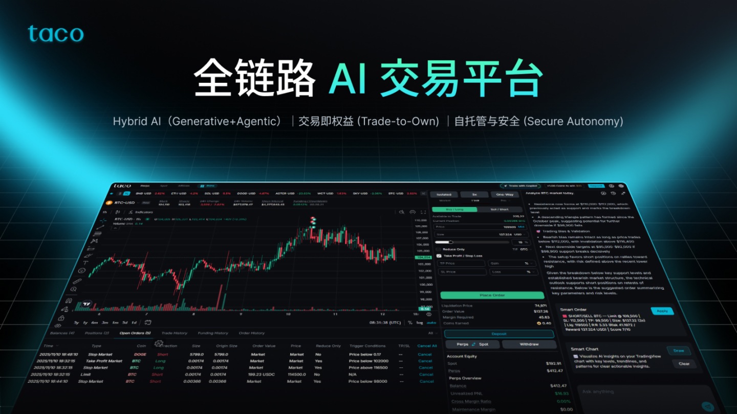 AI 交易的終局從來不是“給建議”,而是直達執行與回報。Taco 發佈全球首個AI 全鏈路交易平台:通過Hybrid AI(融合 Generative AI 與 Agentic AI),將行情洞察、策略生成、下單執行、結算回報與持續學習集成於同一係統。它徹底解決了過去“在 OpenAI/DeepSeek 上分析,再去 Binance/Hyperliquid 手動下單”的割裂體驗,讓 AI 真正具備執行力與反饋閉環。所有交易貢獻都會在鏈上實時計量並獲得權益分配(Trade-to-Own),同時資産全程保持自託管與可審計(Secure Autonomy)。Taco 的使命很簡單:讓每一次交易更聰明、更公平,也更有價值——Trading Always Creates Opportunities。