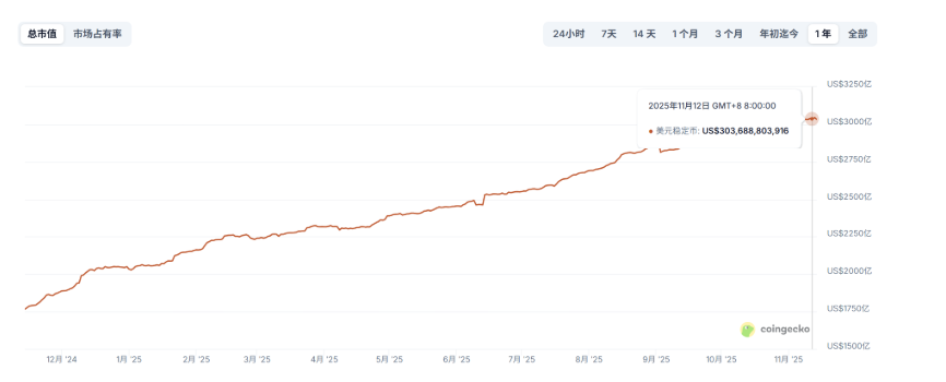 而經歷了多年來的膨脹,CoinGecko 數據顯示,截至 11 月 14 日,全網穩定幣流通量已超過 3000 億美元,其中 USDT 以 1839 億美元位列第一,USDC 以 757 億美元排名第二,兩者體量總和接近 2600 億美元,依然佔據絕對優勢。
