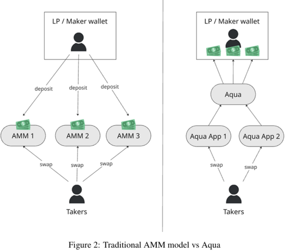 在Aqua出現之前,主流的AMM(自動做市商)模型廣泛採用“池化託管”設計,也就是要求LP(流動性提供者)將他們的資産存入並鎖定在協議中,但是這種設計造成了兩個結構性低效的問題: