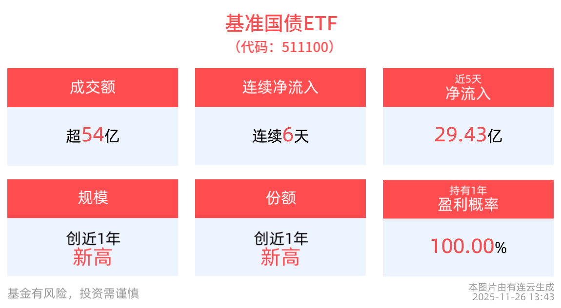 從資金淨流入方面來看,基準國債ETF近6天獲得連續資金淨流入,最高單日獲得10.68億元淨流入,合計「吸金」37.47億元,日均淨流入達6.25億元。份額方面,基準國債ETF最新份額達8803.05萬份,創近1年新高。規模方面,基準國債ETF最新規模達95.18億元,創近1年新高。