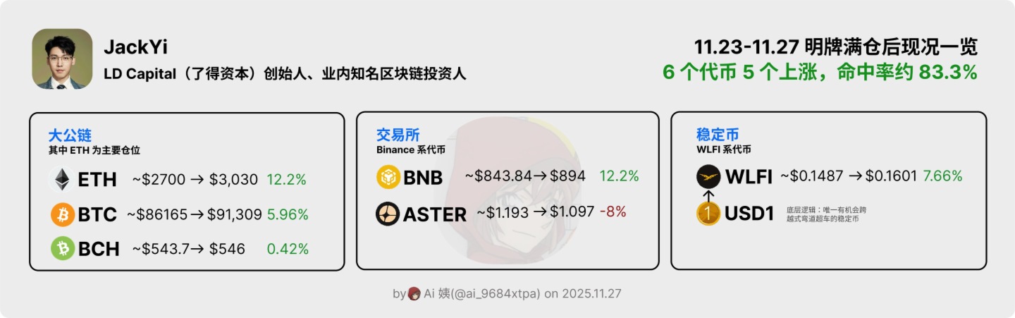 PANews 11月27日消息,據ai_9684xtpa統計,距離Liquid Capital創始人「易理華嚴選」最新版發佈已過去5天,易理華提及的6個代幣中有5個上漲,命中率達83.33%。其中,ETH和BNB以12.2%的漲幅領跑。需注意,除ETH成本明確披露外,其餘代幣成本均基於易老板11月23日14:30發推時間估算,僅供參考。