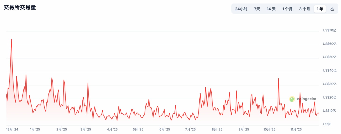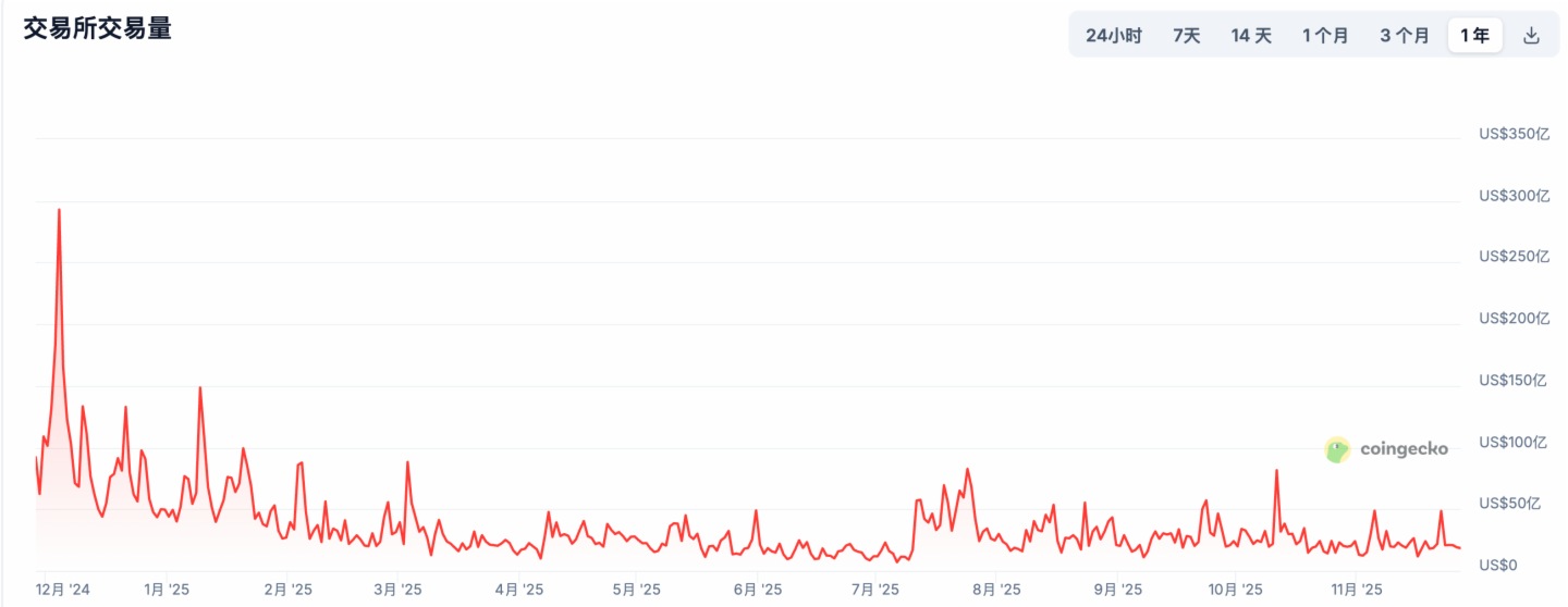 更值得關注的是整體市場熱度的變化——交易量指標較去年大幅下滑。2024年底韓國加密市場曾出現一波瘋狂行情:據統計,2024年12月3日Upbit單日成交額飙升至274.5億美元,創下歷史峰值,約為平日水平的十倍。然而,這一“瘋狂之夜”過後,市場情緒急轉直下,2025年進入降溫通道。2025年11月Upbit日均交易額僅約17.8億美元,較2024年末的高點暴跌了80%。其交易量已連續四個月下降,並趨於在20億~40億美元區間窄幅波動。