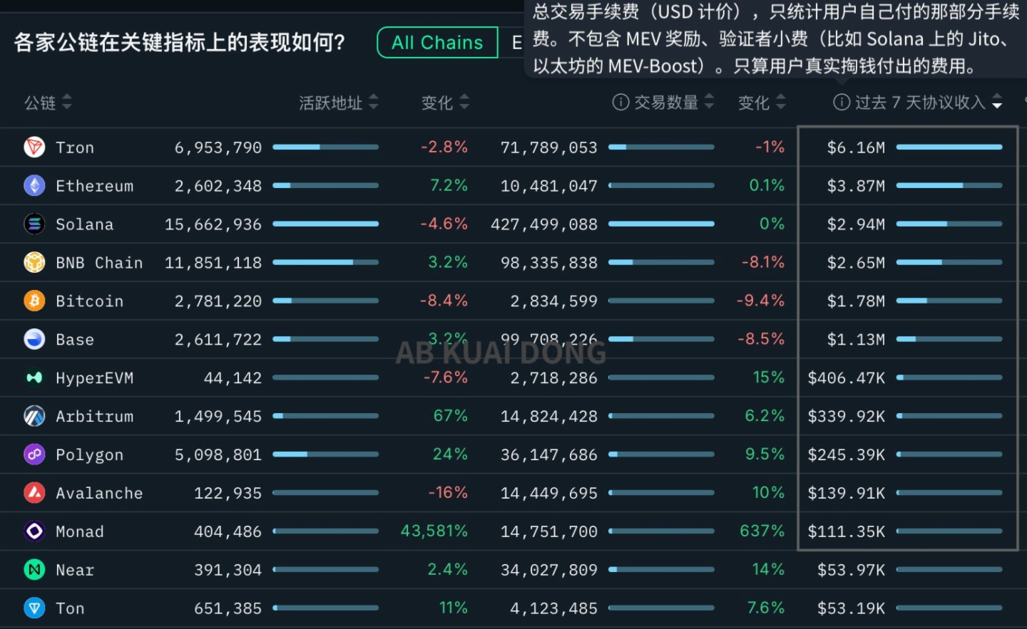 PANews 11月28日消息,據加密KOL AB Kuai.Dong引援Nansen數據,只有11條公鏈在過去7天收入超過10萬美元。前6大分別是波場、以太坊、Solana、BNB、比特幣、Base。它們涵蓋了95%以上的鏈上用戶支出費用。剩餘絕大多公鏈活躍度低、部分收入接近為0。