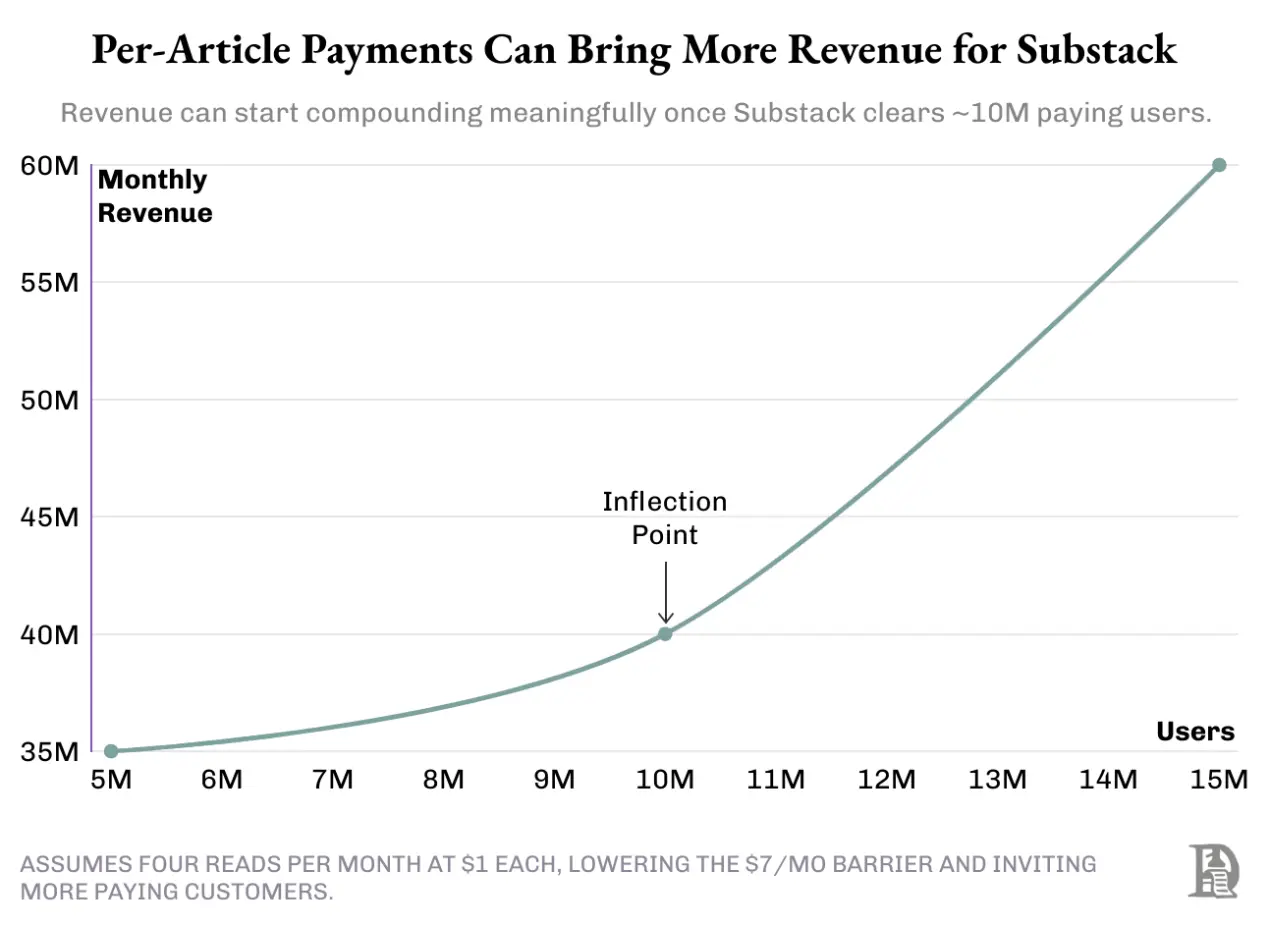 Substack 擁有 5000 萬用戶,付費轉化率為 10%,即有 500 萬訂閱用戶,每月平均支付約 7 美元。當付費訂閱用戶數量翻倍至 1000 萬時,Substack 很可能會從小額支付中獲得更多收益。由於用戶付費門檻降低,更多休閑讀者可能會轉向為每篇文章付費,從而加速收入增長。