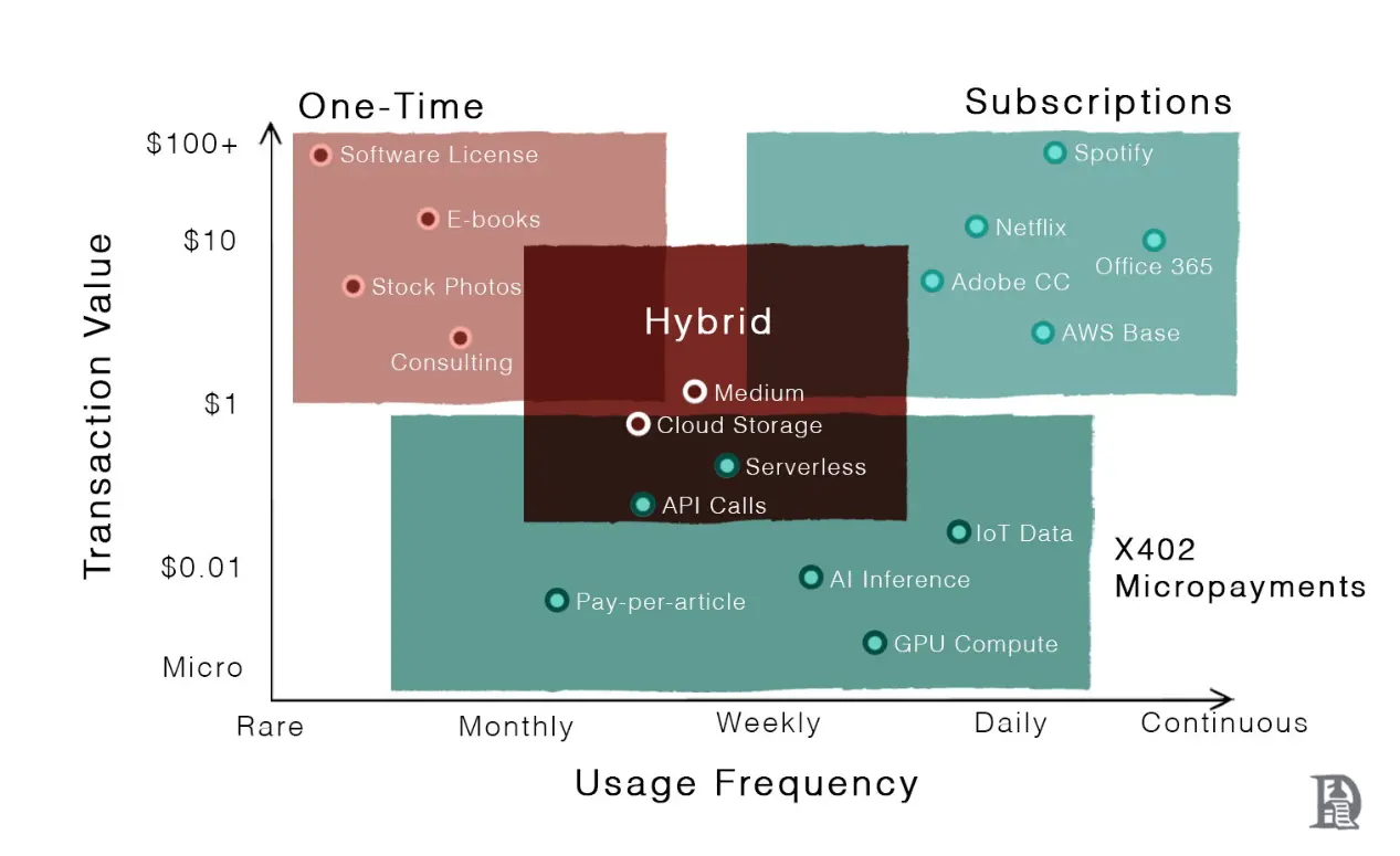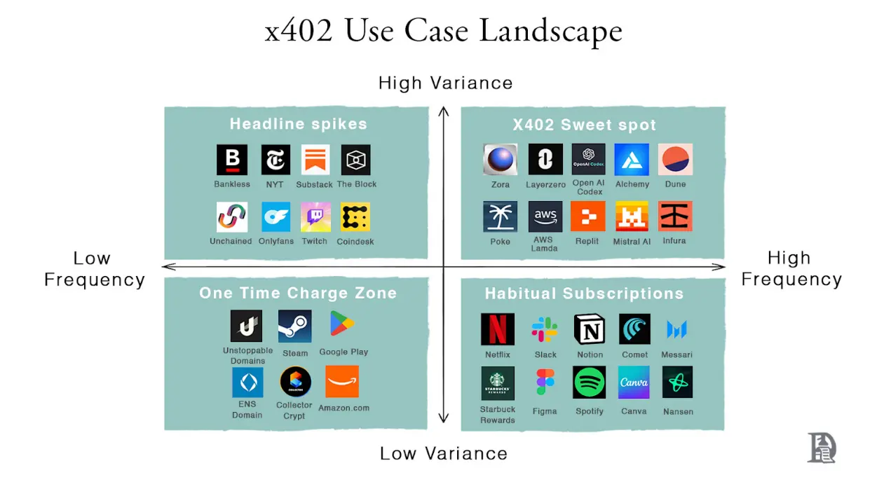 一旦網絡支持原生支付,會在哪裡率先興起?答案在於高頻使用領域,即交易金額低於 1 美元的區域。只要區塊鏈費用保持在合理範圍内,x402 就能以機器速度結算每個請求,最小粒度可達 0.01 美元。