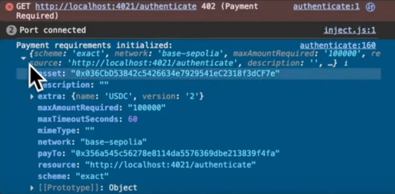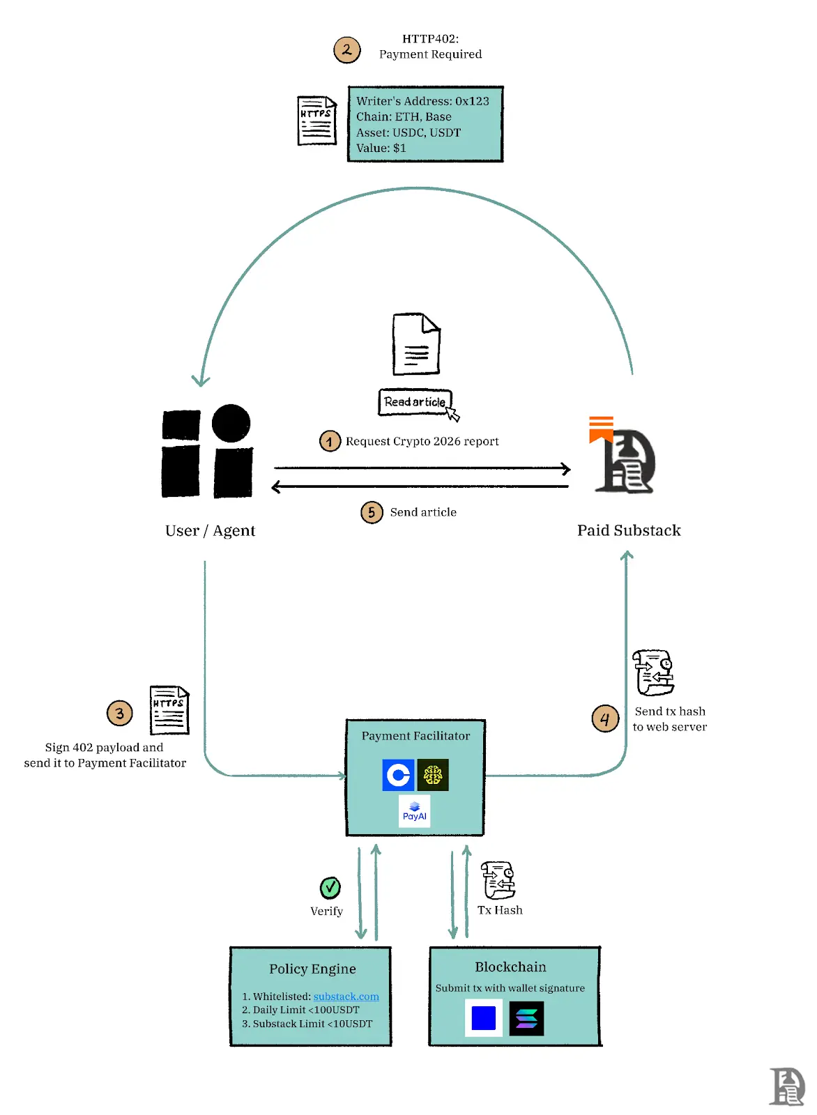 想象一下 Substack 對一篇優質文章收取 0.5 美元。當你點擊“付費閱讀”按鈕時,Substack 會返回一個包含價格、接受的資産(例如 USDC)、網絡(例如 Base 或 Solana)以及政策的 402 代碼。内容大致如下: