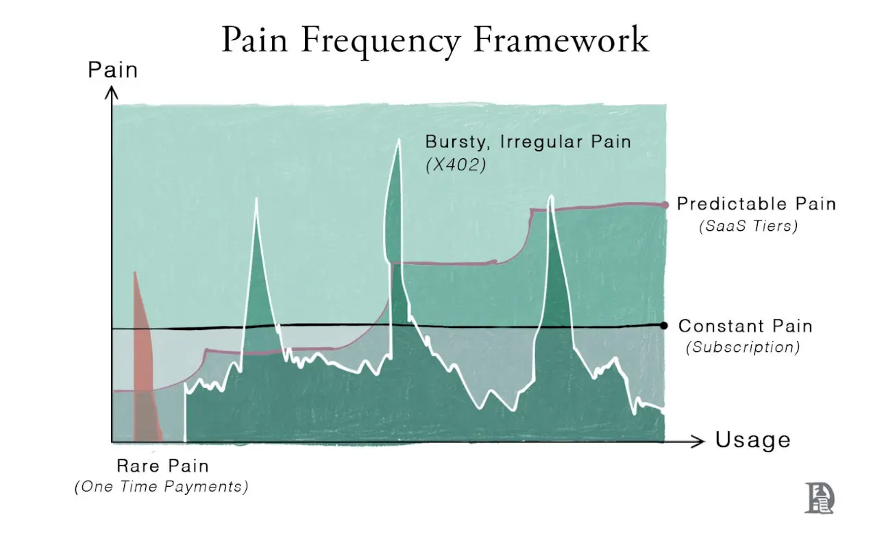 右上角是現代互聯網的核心,涵蓋了 LLM 查詢、代理操作、無服務器突發流量、API 調用、跨鏈交易、批量作業以及物聯網設備通信。使用量既穩定又波動。固定的收費模式雖然降低了付費心理門檻,但卻無法準確反映這種現實。輕度用戶支付過高的費用,而重度用戶則享受補貼,導致收入與實際使用量脫節。