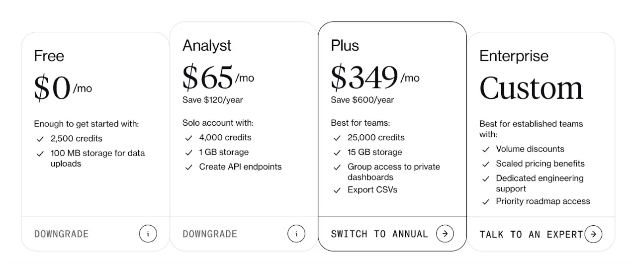 因此,基於席位收費的産品正逐漸向計量收費模式轉變。保留用於協作和支持的基礎套餐,但對高負載應用收費。例如,Dune 提供每月有限的額度。小型、簡單的查詢費用低廉,而運行時間更長的大型查詢則需要消耗更多費用。