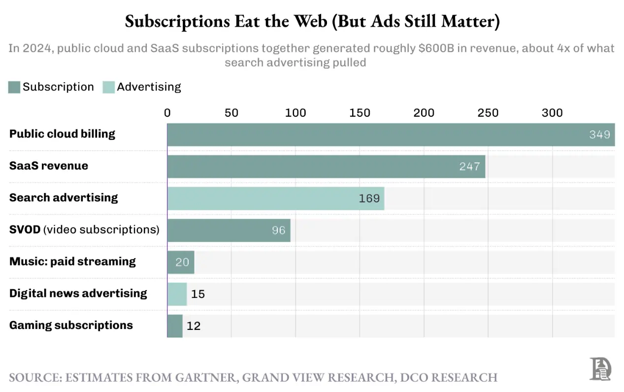 這種模式之所以有效,是因為人的注意力會遵循一定模式。大多數人晚上看 Netflix(網飛)。每周都會從亞馬遜訂購商品。亞馬遜的 Prime 會員服務包含運費、退貨服務和流媒體服務,每年只需 139 美元。訂閱服務消除了很多煩惱。如今,亞馬遜開始向訂閱用戶推送廣告以提高利潤率,迫使用戶要麼觀看廣告,要麼支付更多費用。當聚合商無法證明訂閱服務的合理性時,他們就會像谷歌那樣依靠廣告來盈利,靠的是吸引注意力而非激發購買意願。