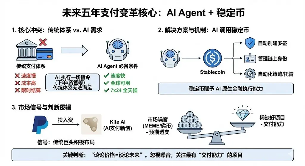 如果讓我用一句話概括未來五年的超級趨勢,那一定是由AI Agent驅動的支付方式的革新。當 Agent 開始為用戶執行一切由人到應用終端的所有執行指令,比如挑選,下單,到資産配置,策略管理等。支付將不再是用戶動作的終點,而是智能體運行的“底層能力”。