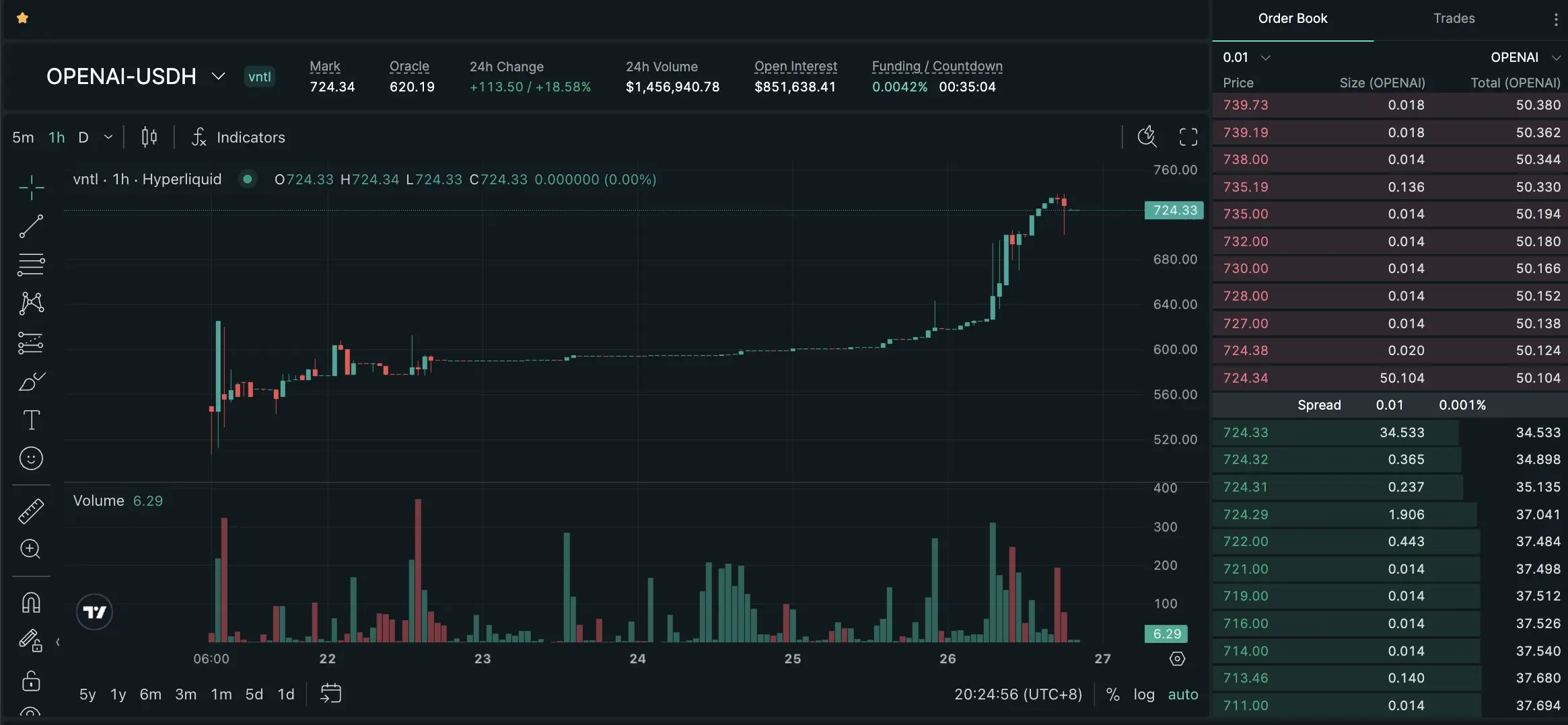 就在上周,Hyperliquid 直接上綫了 OPENAI-USDH 交易對。這意味著一家尚未上市、估值完全由私募市場主導的公司,被拉進了一個 7×24、可加槓桿、全球可訪問的鏈上市場,形成了對 Pre-IPO RWA 的降維打擊。