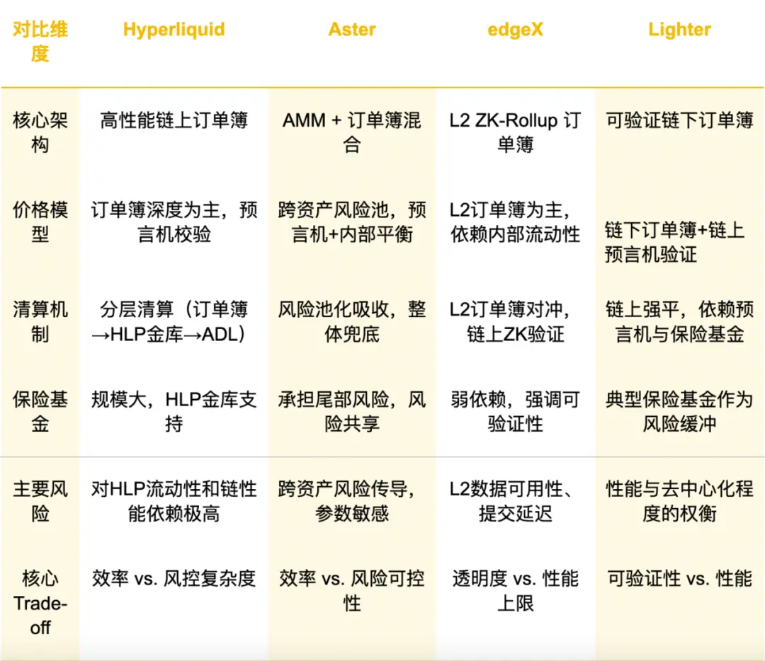 當前主流平台正朝著 CLOB 或 CLOB-Centric 的混合方案轉型,以追求更好的撮合精度與資本效率。以下表格係統對比了四個代表性項目的風險模型特點與核心權衡:
