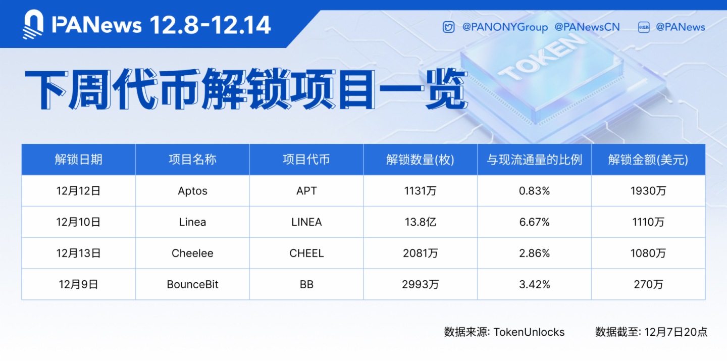 PANews 12月7日消息,Token Unlocks數據顯示,APT、LINEA、CHEEL等代幣將於下周迎來大額解鎖,其中: