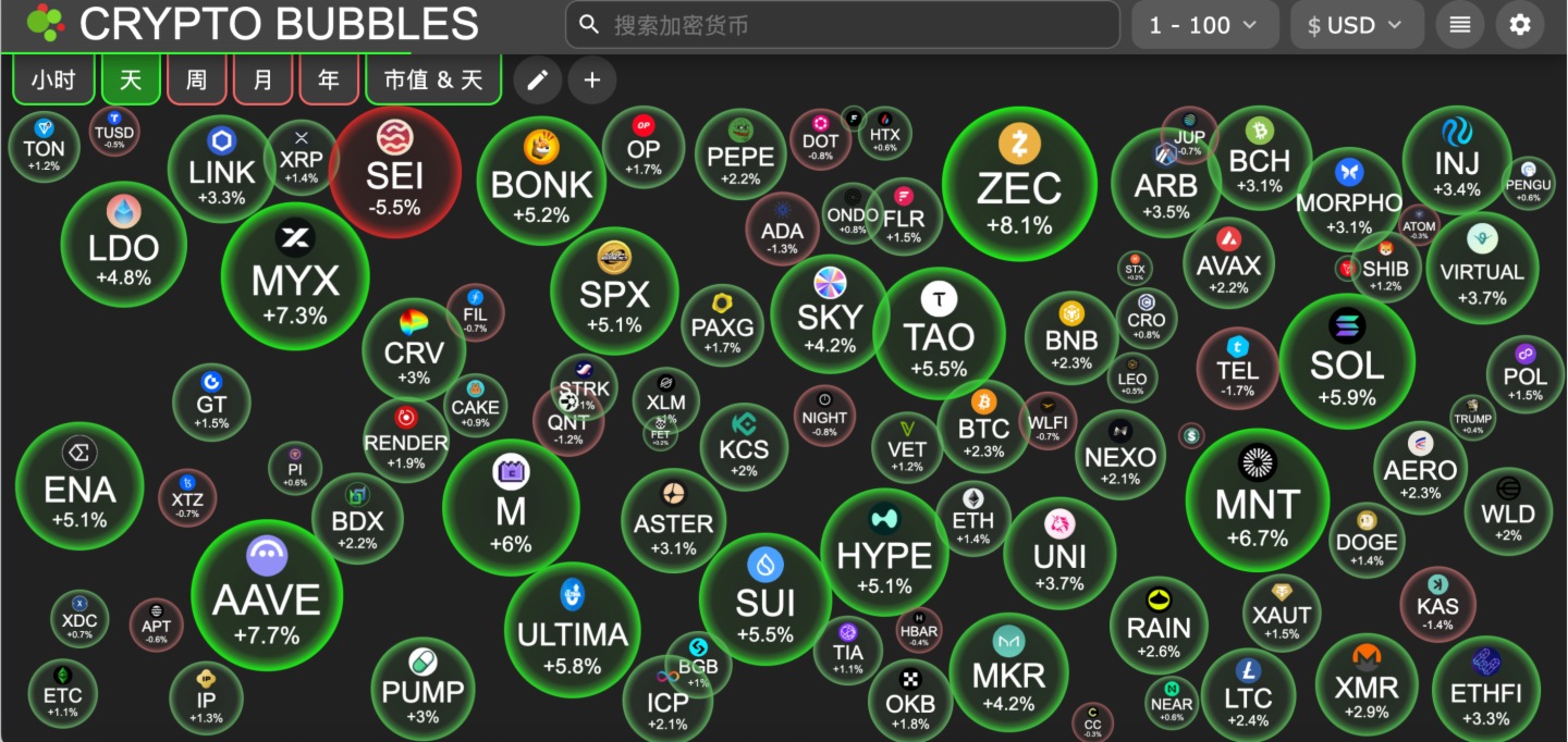 今日市值前100幣種最大漲幅:Zcash漲8.1%、Aave漲7.7%、MYX Finance漲7.3%、Mantle漲6.7%、MemeCore漲6%。