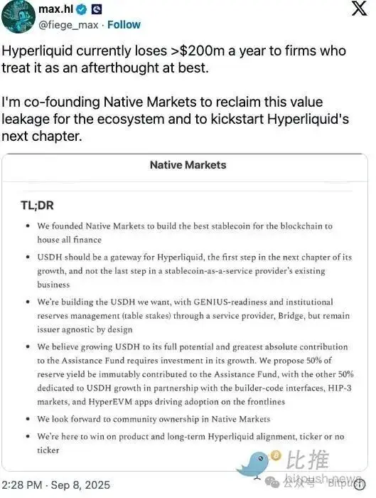 但最終,Native Markets 贏得了競標——這是一個由備受尊敬的 HYPE 貢獻者 Max Fiege、前 Uniswap Labs 首席運營官 MC Lader 和 Paradigm 研究員 Anish Agnihotri 領導的團隊。