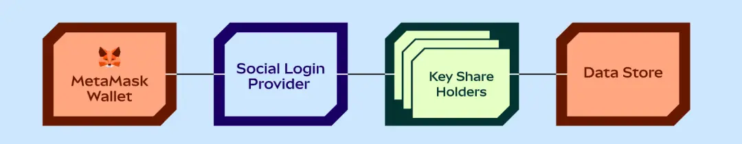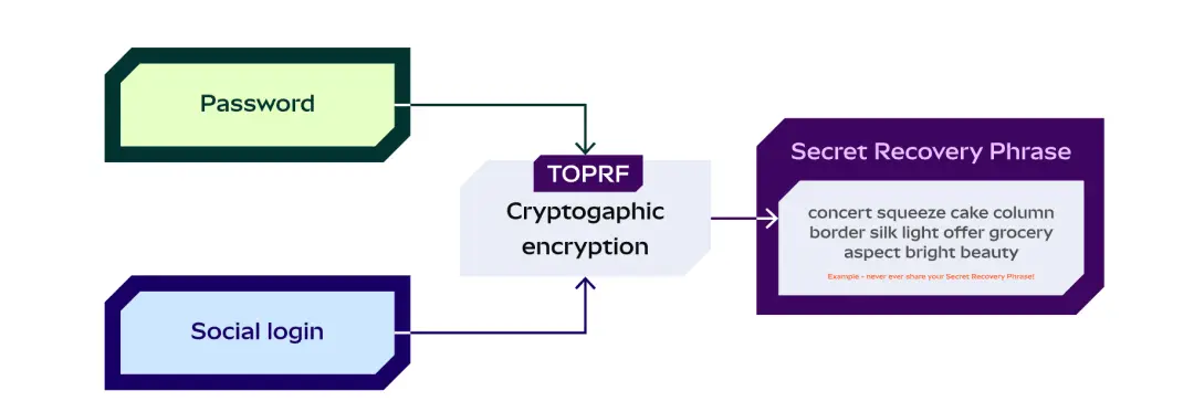 然後這個TOPRF 通過典型SSS(Shamir Secret Sharing,秘密分享算法),分片分發出去。而這些社交登錄的服務商則會通過社交驗證得到加密數據,還要結合用戶的密碼才能完全解密。